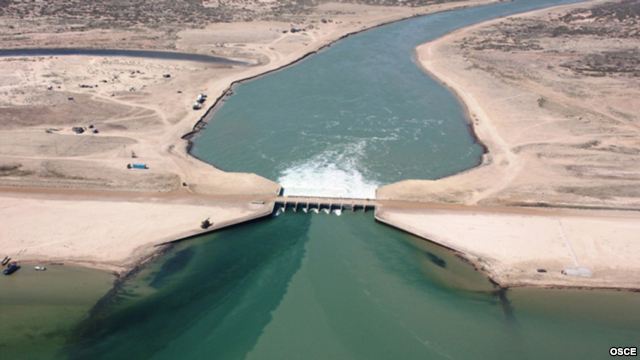 Язовирната стена, пазеща останките от Аралско море