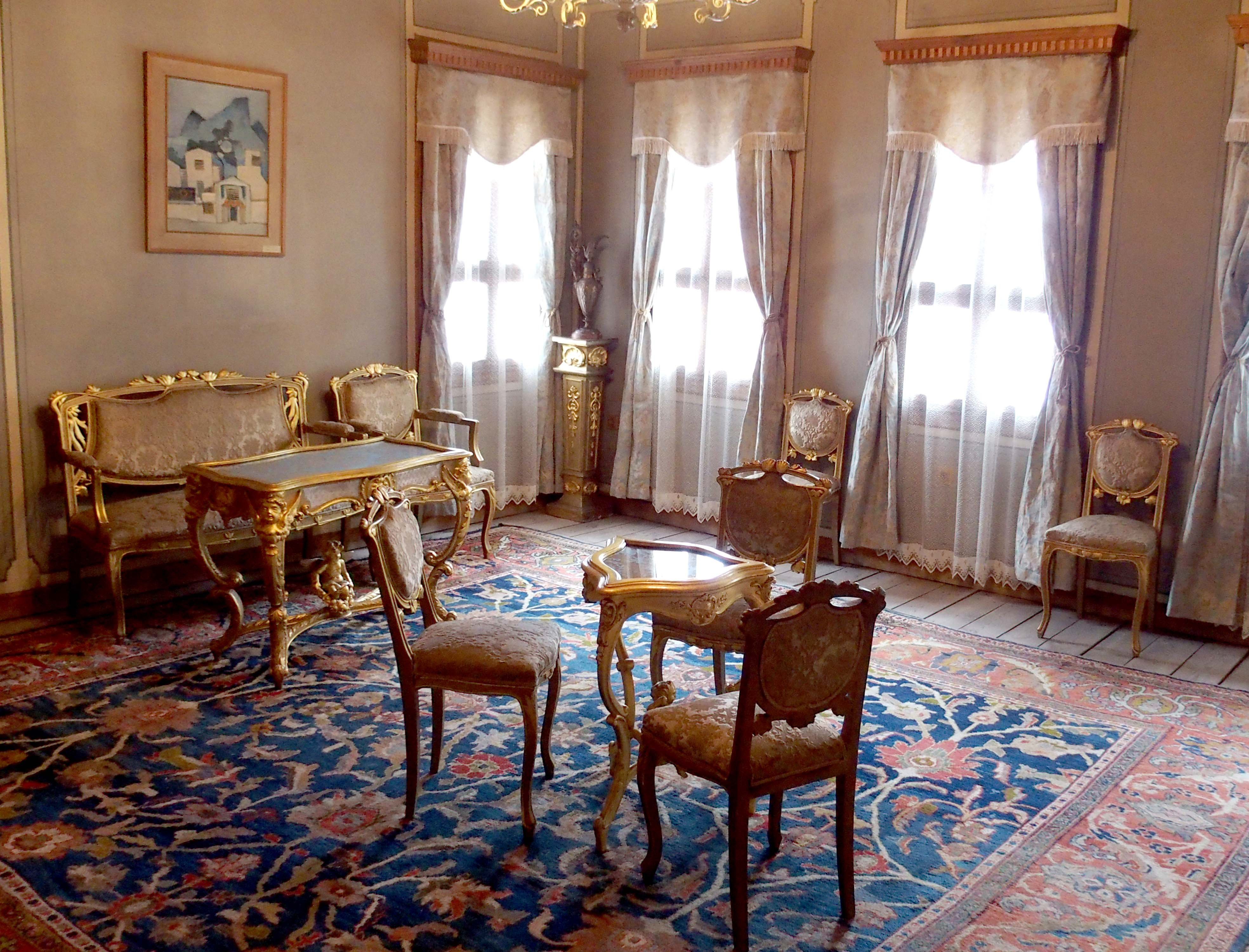 Особено красиви са писалището, канапето с фурнир от махагон и кристалните огледала.