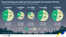 За периода януари-юни в ЕС са регистрирани 1,193 милиарда нощувки, или с 11 милиона повече от същия период на 2019 г., когато са били 1,182 милиарда. Ръстът спрямо същия период на 2022 г. е със 136 милиона нощувки, или с цели 12,9 на сто. Спрямо 2021 г. нощувките са се увеличили със 786 милиона.