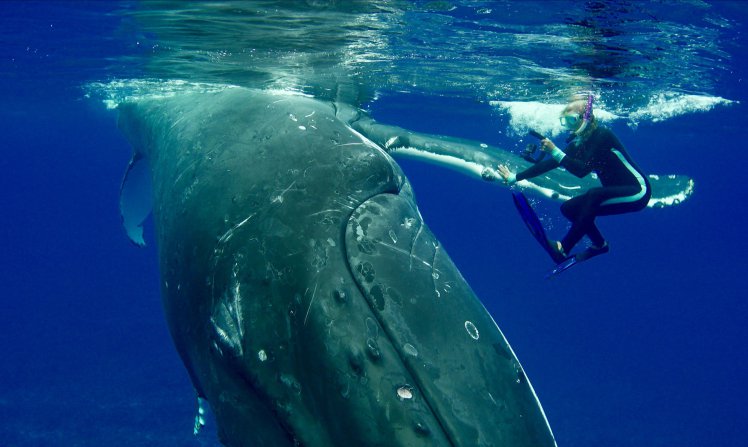 Удивителната случка е станала край бреговете южния тихоокеански остров Кук, където биологът, специалист по китове, Нан Хаузър се гмуркала заедно с екипа си, съобщава сайтът metro.co.uk.