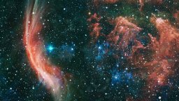 Нова снимка подчертава празничния вид на купа чрез стратегически избор на цветове и ротация. "Игличките" са в зелено, създадени от газ, видим в оптичните данни от телескопа WIYN на Националната научна фондация и разкриват още един поглед към празничния галактически куп.