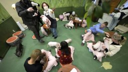 В една от последните сутрини те бяха сред десетките клиенти, които си правеха селфита и се усмихваха. Прасетата от миниатюрна порода се разхождаха из помещението и търсеха уютен скут, в който да се гушнат.