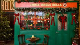 Наречена The Three Jingle Bells, този временен бар за бира е украсен с носталгични коледни плакати, и празнични гирлянди, плюс купа с Quality Streets на бара.