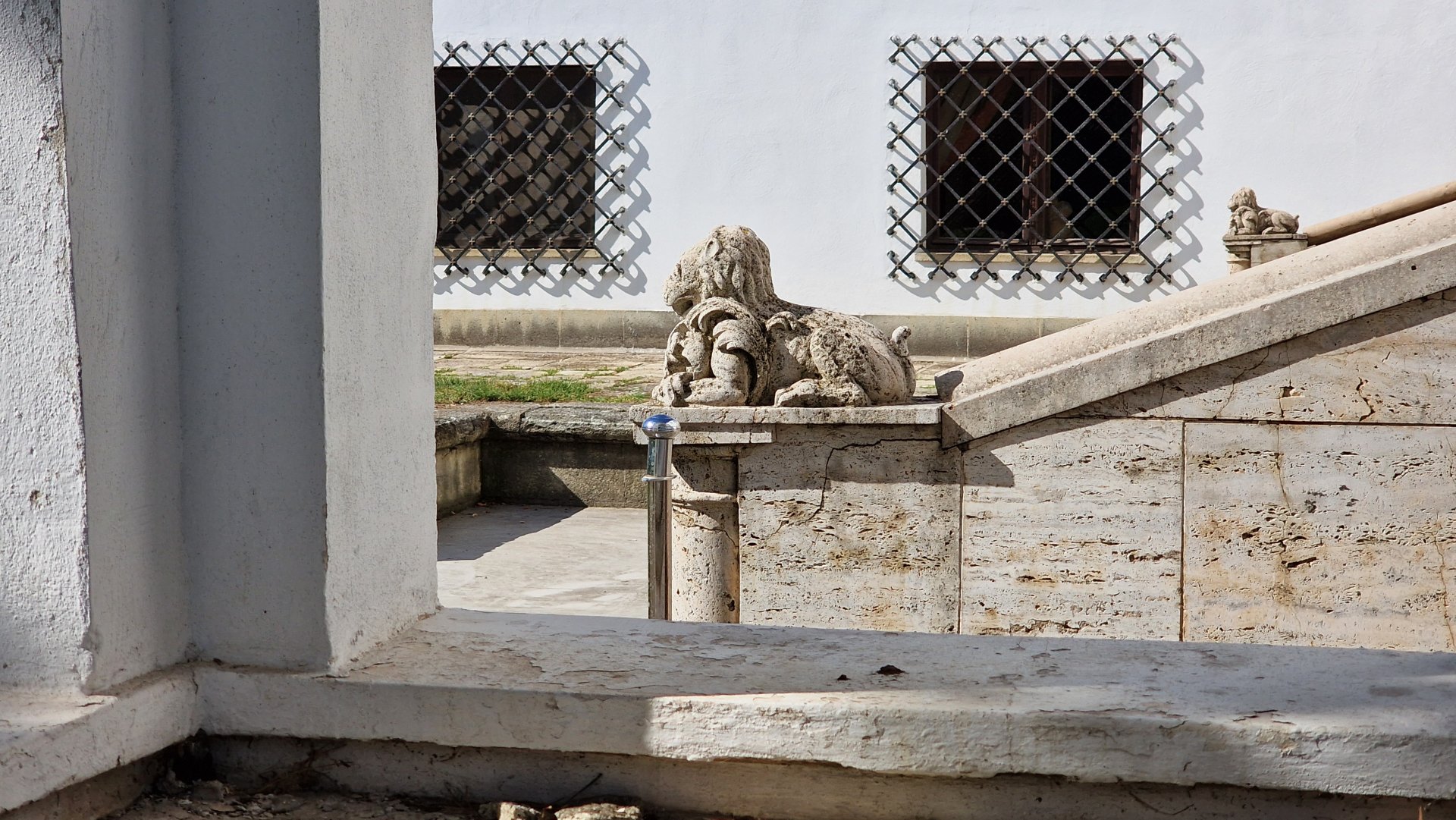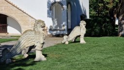Грифони пазят стълбището към мраморната зала. "Те са символ на кураж и сила и предпазват от лоши духове кралската фамилия", разказва за БТА ескурзоводът в двореца. Тук са и някои от роклите на принцеса Маргарита - пазителката на румънската корона. В така наречената Голяма трапезария масата е аранжирана като за вечеря. За разлика от филмите и сериалите, тук всичко е по френски маниер, най-височайшите гости седят в средата, за по-добра социализация. Порцеланът е "Розентал", съдовете са докарани от Великобритания с Ориент експрес. Дървена врата отвежда към кухнята, а отгоре има икони - ролята им е да благославят храната преди да бъде сервирана.