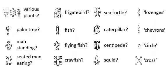 Самите глифи са чудо на художествената и потенциално лингвистична сложност. Почти всички фигури с глави са ориентирани вертикално и са обърнати напред или надясно, по посока на писането. Птиците са често срещани, като много от тях приличат на фрегатата, свързана с върховния бог Макемаке. Някои глифи имат поразителни прилики с петроглифите, открити на целия остров, което подсказва за възможна връзка между двете художествени традиции.