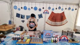 Производители на кисело мляко и сирене от региона, много от които говорят китайски, предлагат мостри и продукти за продажба.