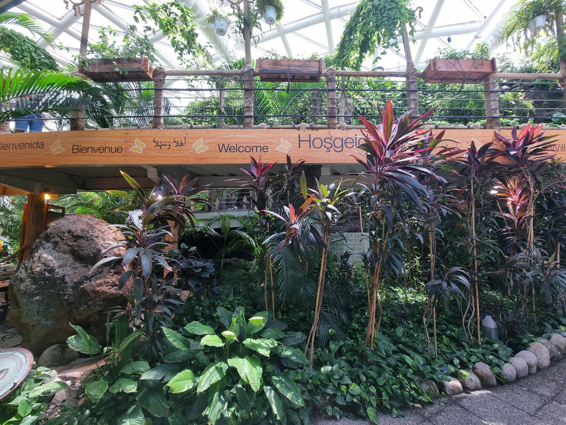 Пеперудите са буквално навсякъде в огромната тропическа градина, в която има водни басейни и пещера. Понякога пеперудите кацат върху посетителите.