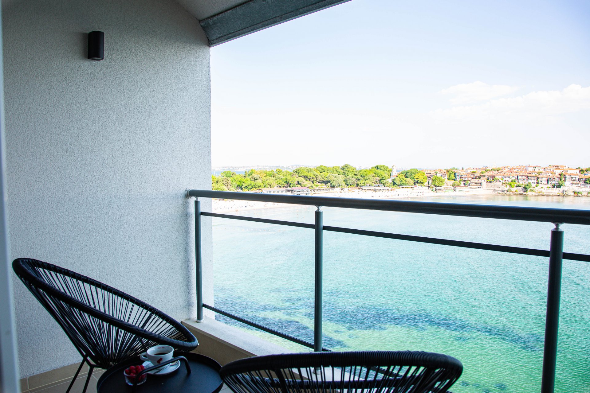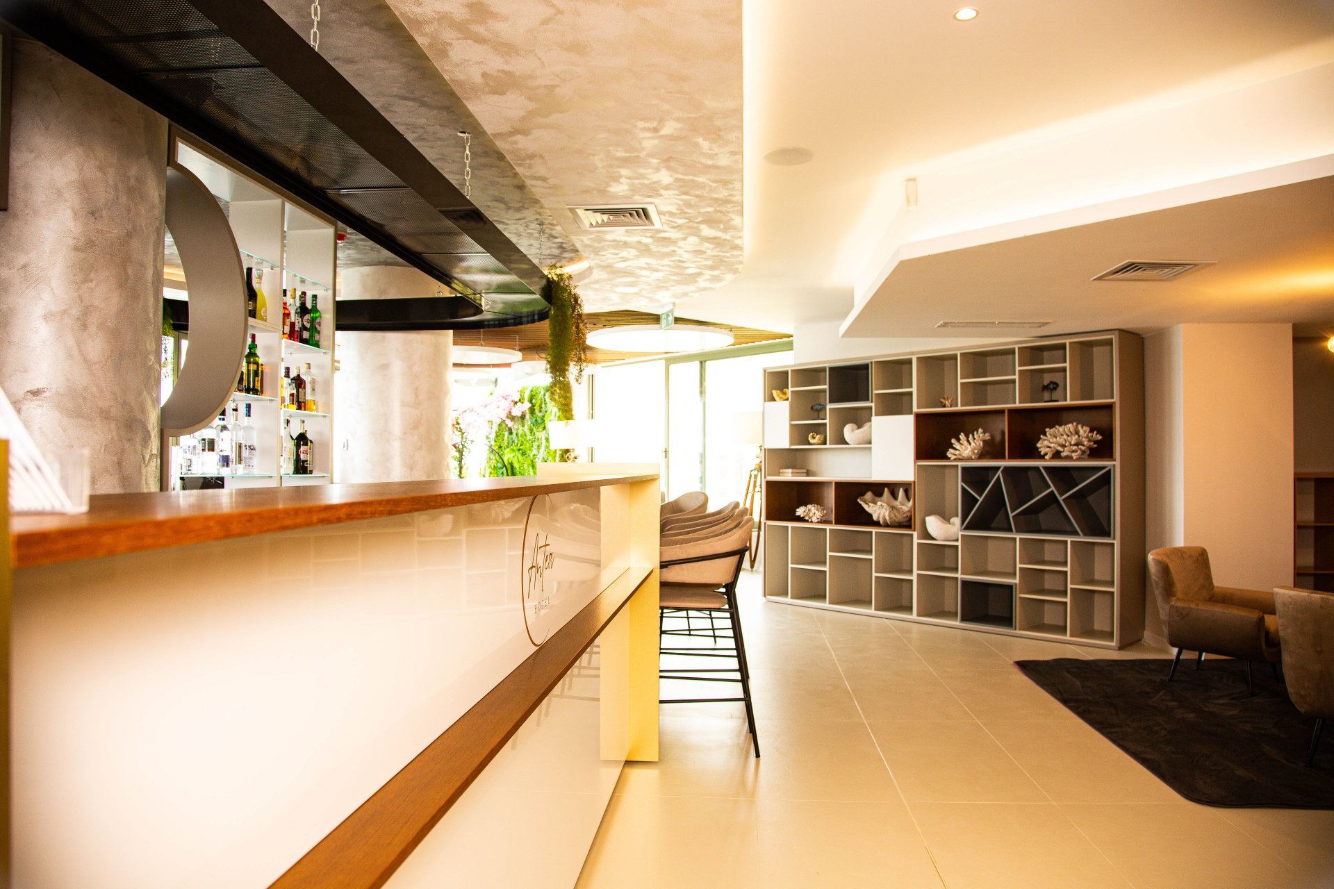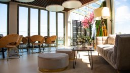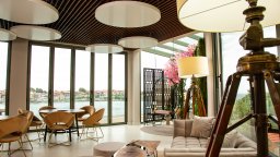 Интериорът извежда естествените материали на преден план с акцент върху декоративни предмети като вази, лампи и произведения на изкуството, вдъхновени от древен Созопол. Дървото, изчистените линии и цветни акценти се преплитат в уникално творение, олицетворяващо морския дух. Елегантен акцент е изящната витрина с естествени корали, която ще помогне на гостите да се потопят пълноценно в усещането за морска ваканция.