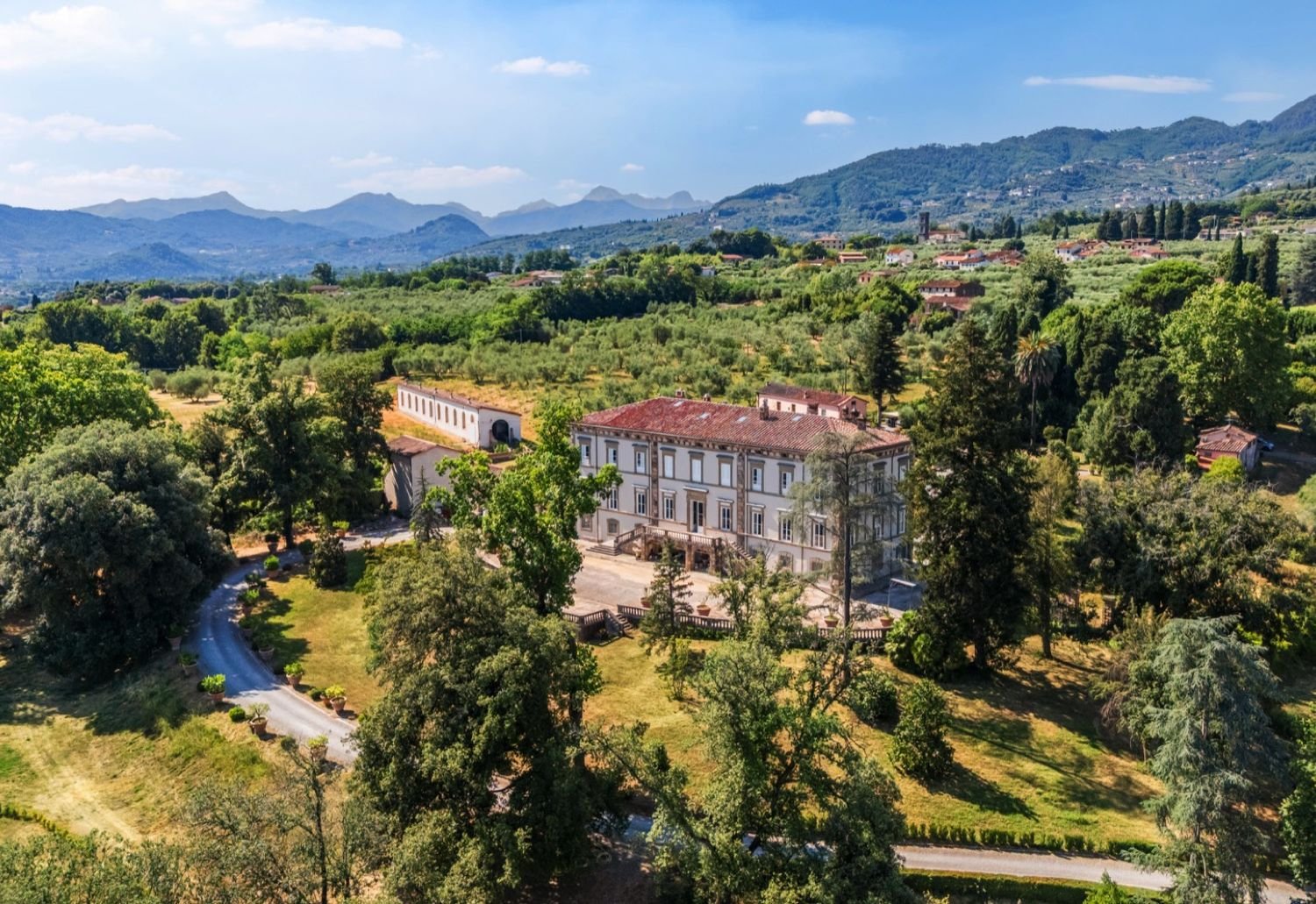 Главната вила в околностите на Лука, с приблизително 2500 квадратни метра жилищна площ, се простира на три нива и е заобиколена от парк, както и от три хектара маслинови горички и ливади. Имотът включва също елегантна пристройка, напълно запазена оранжерия от XVIII век, живописен параклис и два басейна, заобиколени от буйна растителност.