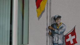 Може би първата спирка на маршрута, стенописът на кметството на главната улица на градчето, обяснява всичко най-добре - усмихнат работник държи стълб с германско знаме, а от джоба на якето му стърчи швейцарско. Въпреки объркването, че обитават ничия земя, животът тук изглежда доста добър.