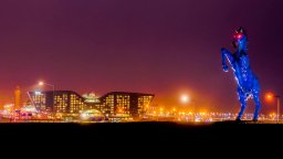 С височина от почти 10 метра "Синята кобила" е една от най-внушителните скулптури в Съединените щати. Тя стои на мощните си задни крака, с изпъкнали вени и червени светещи очи, които сякаш пронизват нощта.